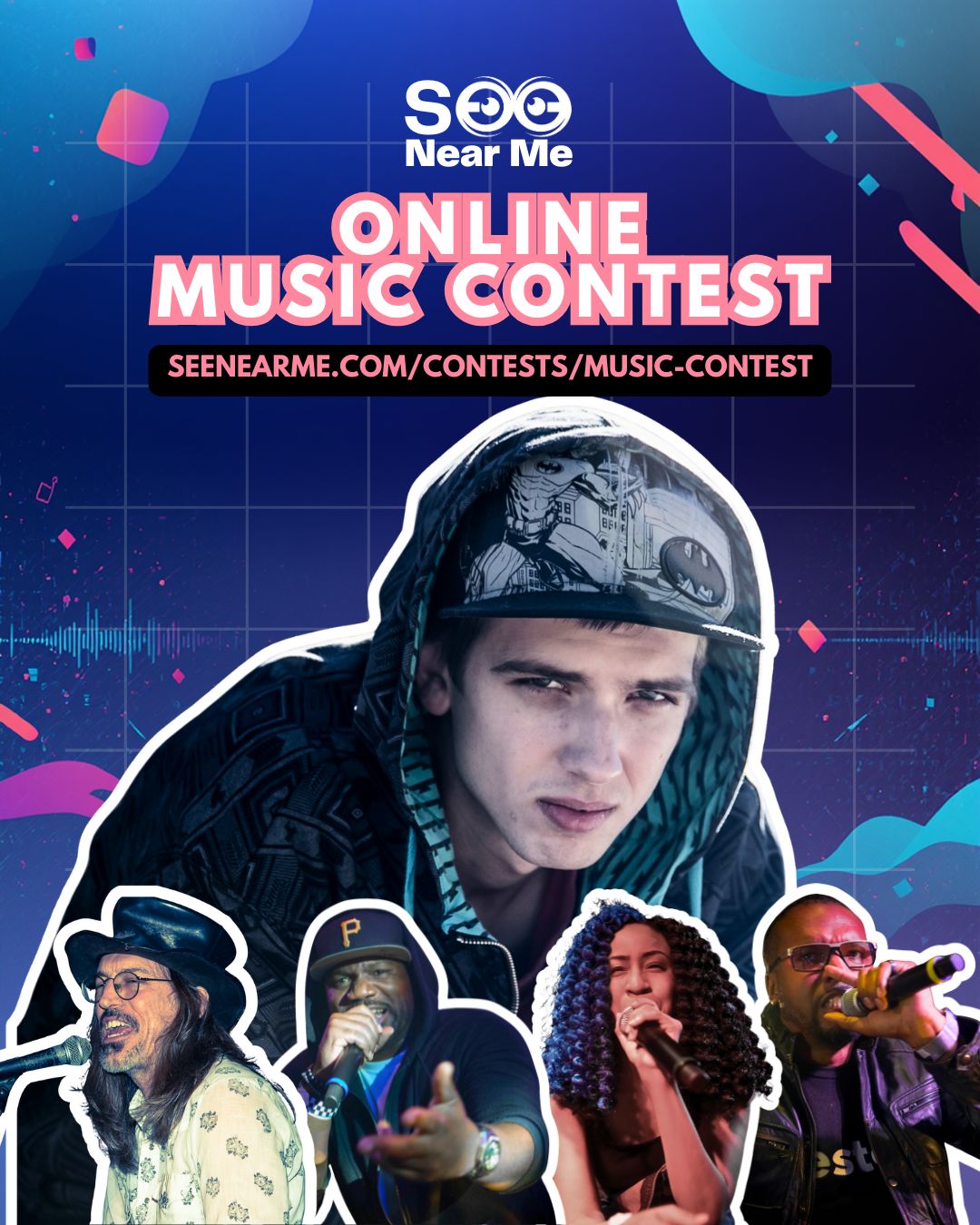 See Near Me Online Music Contest invites solo artists, bands, and duos from all genres to submit their original music and compete for cash awards, marketing opportunities, and more. Whether you're an emerging artist or a seasoned performer looking to make a lasting impact, we want to hear your unique sound.$32,000 in Cash